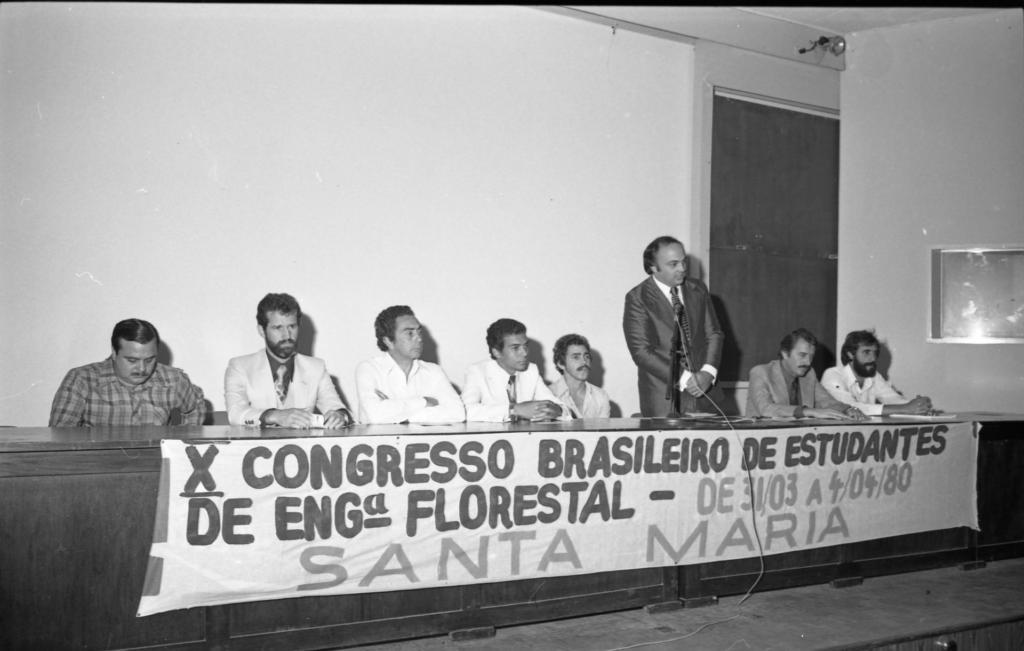 Audiodescrição da imagem: Fotografia horizontal, preta e branca levemente enquadrada na diagonal da direita para a esquerda de oito homens atrás de uma mesa em um ambiente interno. Sete homens estão sentados e um está em pé. Todos têm cabelos curtos e olhos escuros. Estão com expressões sérias e pensativas. O primeiro homem, à esquerda e um pouco mais ao fundo da imagem, está de perfil direito. Tem cerca de 30 anos, é magro, tem pele clara, cabelos lisos, barba e bigode fartos escuros. Está com uma camisa clara. As mãos estão entrelaçadas sob papéis em cima da mesa. À direita, o segundo homem. Tem aproximadamente 40 anos, é magro, tem pele clara, cabelos lisos e bigode farto escuro. Está com um paletó de tom claro, camisa e gravata de tom escuro e usa um relógio claro no pulso esquerdo. Está com o olhar baixo e os antebraços sobre folhas de papel em cima da mesa. O terceiro homem é o único que está em pé. Tem cerca de 40 anos, é gordo e mais baixo, tem pele clara e cabelos ondulados. Está de paletó escuro, camisa de tom claro e gravata xadrez de tom escuro. Fala em um microfone que está sobre a mesa, com as mãos entrelaçadas em frente ao corpo. O próximo homem tem cerca de quarenta e cinco anos, é magro, tem pele clara, cabelos ondulados e bigode farto escuro. Está de camisa de tom claro e olha para a frente. O quinto homem tem cerca de trinta anos, é magro, tem pele negra e cabelos cacheados. Está de paletó e uma camisa de tons claros e gravata escura. As mãos estão entrelaçadas sobre a mesa. Em seguida, um homem com cerca de cinquenta e cinco anos, magro, de pele clara e cabelos ondulados. Está com uma camisa de tom claro. Os braços estão cruzados na altura do peito. O penúltimo homem tem cerca de trinta e cinco anos, é magro, tem pele clara, cabelos ondulados, barba e bigode fartos escuros. Está de paletó, camisa e gravata de tons escuros. Usa um relógio claro no pulso esquerdo. Os antebraços estão apoiados sobre a mesa e entre as mãos segura um papel enrolado. O último homem tem aproximadamente quarenta e cinco anos, é gordo, tem pele clara, cabelos lisos e bigode farto escuro. Está de camisa xadrez de vários tons. A cabeça está abaixada e uma das mãos está no apoio de braço da cadeira onde está sentado. A mesa é retangular e comprida de tom escuro. Na frente da mesa há uma faixa horizontal e clara, presa por tachinhas, com a inscrição “X CONGRESSO BRASILEIRO DE ESTUDANTES DE ENG.ª FLORESTAL – DE 31/03 a 04/04/80 SANTA MARIA” em letras maiúsculas em tons diferentes. À esquerda do primeiro homem, uma parede clara, com uma reentrância com um espelho próximo à ele. O espelho reflete um ponto de luz. Atrás dos homens uma parede clara, com uma abertura grande à esquerda, fechada por madeiras escuras. Acima da abertura, na parede, um suporte com uma lâmpada. À esquerda e ao fundo, parte do teto de pvc claro. À esquerda, na parte inferior, parte de um palco de madeira escura, onde estão os homens e a mesa.
