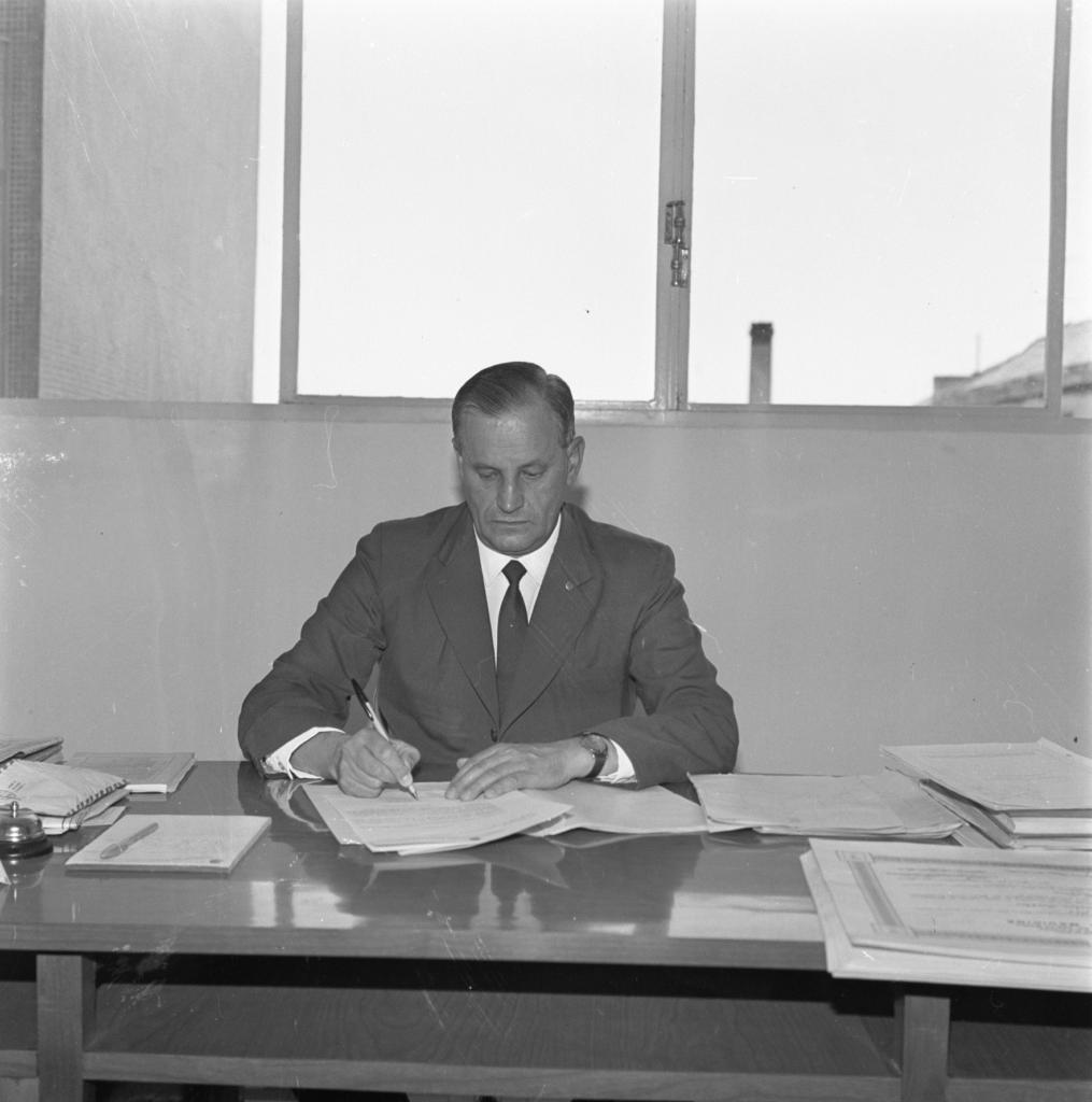 Fotografia vertical em preto e branco de um homem sentado atrás de uma escrivaninha, em uma sala. Ao centro da imagem, o homem de frente para nós, enquadrado do tórax para cima. Tem aproximadamente cinquenta anos, é magro, tem pele clara, cabelo liso, curto e escuro. Está de blazer, gravata de tons escuros e de camisa de tom claro. Usa um relógio escuro no pulso esquerdo. Está com a cabeça abaixada, a expressão séria e escreve com uma caneta em uma folha de papel sobre a escrivaninha. A escrivaninha é retangular, de madeira escura. Sobre ela, um bloco de anotações com uma caneta, uma campainha de mesa, um envelope carimbado e com contorno escuro, um livro de capa clara e pilhas de folhas de papel. Ao fundo, uma janela fechada, de estrutura de metal, com quatro vidros na vertical. Através dos vidros, o céu claro. Abaixo da janela, uma parede clara.
