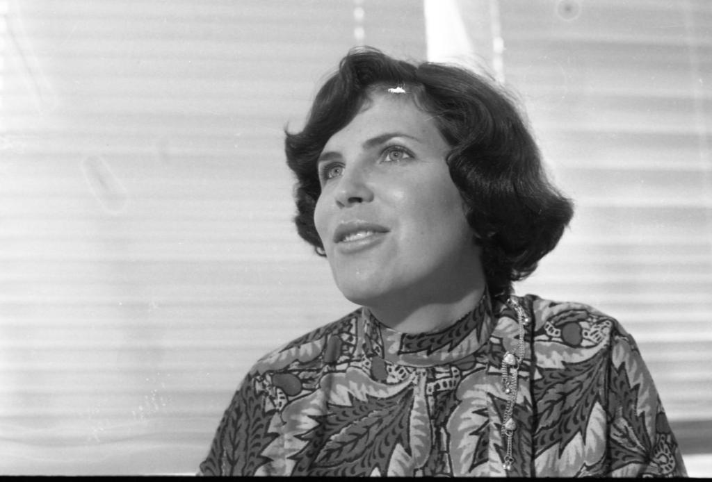 Imagem 2: Fotografia retangular, horizontal, em preto e branco de uma mulher em um ambiente interno. Ela está enquadrada da cabeça ao tórax, levemente de perfil esquerdo. Tem aproximadamente 35 anos, é branca, tem cabelos ondulados, curtos e escuros e olhos claros. Está com uma blusa clara com estampa de folhas grandes escuras, com um detalhe na altura do peito, feito por uma fita pendente do mesmo tecido da blusa, sobreposta por uma corrente com dois corações pequenos de metal. Ela sorri. Ao fundo, persianas horizontais, claras, fechadas.