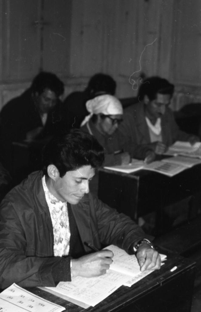 Audiodescrição da segunda fotografia: Fotografia vertical preta e branca, de pessoas sentadas junto a mesas em um ambiente interno. São cinco pessoas e três mesas. Todos estão de perfil direito para nós e com as cabeças abaixadas. Na primeira mesa, à esquerda e à frente na imagem, um homem. Tem aproximadamente quarenta anos, é magro, tem pele clara, cabelos curtos, volumosos e escuros, nariz avantajado, lábios finos, esboçando um leve sorriso. Está com uma jaqueta escura. Está com as mãos em um livro aberto sobre a mesa, onde ainda há mais dois livros fechados. As quatro outras pessoas estão desfocadas na imagem. À direita e mais ao fundo, uma mulher e um homem estão sentados em outra mesa. A mulher tem cerca de cinquenta e cinco anos, pele clara e cabelos escuros. Usa uma bandana clara amarrada na cabeça e óculos de grau. Está de blusa de tom escuro. As mãos estão sobre um livro aberto na mesa. O homem tem cerca de cinquenta e cinco anos, pele clara e cabelos curtos, volumosos e escuros. Está de jaqueta e camiseta claras. As mãos estão sobre a mesa, e uma delas segura a página de um livro que está em frente à ele. Vê-se as pernas deles abaixo da mesa. Atrás desta mesa, outra com mais duas pessoas. Um rapaz com a idade entre quarenta e cinco anos, pele clara, cabelos curtos, volumosos e escuros. Está de casaco de tom escuro e uma blusa de tom claro com gola “V”. A mão direita está sobre a mesa. A última pessoa está parcialmente encoberta pela mulher da mesa anterior. Tem cabelos curtos e escuros. Está de roupa escura. Ao fundo e à direita, o encontro de duas paredes de madeira claras. Na parede esquerda, uma janela de madeira fechada.