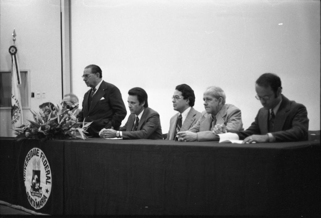 Audiodescrição da imagem: Fotografia horizontal em preto e branco de sete homens atrás de uma mesa em um ambiente interno. Estão lado à lado, de perfil esquerdo, com o primeiro mais próximo à nós, à direita da imagem, e o último deles, mais ao fundo e a esquerda. Todos têm a pele clara e cabelos curtos. Os quatro primeiros homens, da direita para a esquerda, estão sentados. O primeiro, tem cerca de quarenta anos, cabelos escuros. Usa blazer escuro e óculos de grau. Está com a cabeça abaixada e a expressão neutra. As mãos estão sobre a mesa segurando um livro e uma caneta. À esquerda, o segundo homem. Tem cerca de sessenta anos, cabelos claros, a pele do rosto enrugada. Está de blazer de tom claro. Está com a expressão neutra, olhando para a frente e com as mãos cruzadas sobre a mesa. O próximo homem, tem cerca de quarenta anos, cabelos escuros. Está de blazer claro e usa óculos de grau. Também está com a expressão neutra, olhando para a frente. O quarto homem, tem em torno de quarenta anos, cabelos escuros. Está de blazer de tom escuro e usa um relógio. Olha para a frente com expressão séria. O quinto homem está em pé. Ele tem aproximadamente cinquenta anos, cabelos escuros. Está de terno escuro e usa óculos de grau. Olha para a frente com a expressão séria e uma das mãos está dentro de um bolso da calça, em frente à ele, sobre a mesa, um arranjo de flores. O sexto e sétimo homens estão sentados e parcialmente cobertos pelo arranjo de flores. O sexto homem, tem cerca de sessenta anos, cabelos claros e usa óculos de grau. Tem a expressão séria. O último homem tem cabelos escuros. A mesa se estende da direita para a esquerda e para o fundo da imagem. Está coberta por uma toalha de tom escuro, com um brasão na frente, com a escrita “Universidade Federal de Santa Maria” à esquerda e, ao fundo, o encontro de duas paredes claras. Na parede esquerda, uma pilastra com uma bandeira de tom claro. A outra parede, atrás dos homens, ocupa quase toda a extensão da imagem.