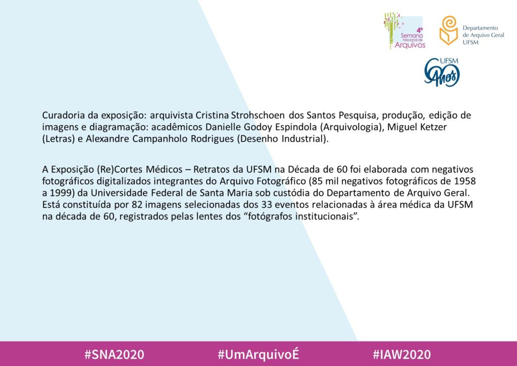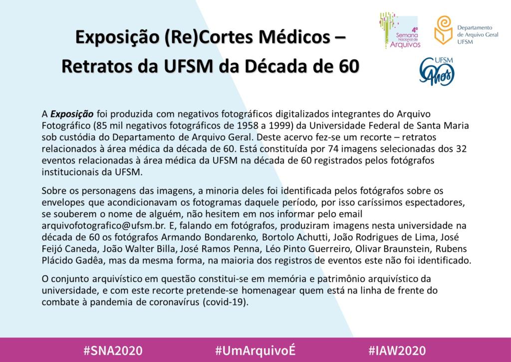 A Exposição (Re)Cortes Médicos – Retratos da UFSM na Década de 60 foi produzida com negativos fotográficos digitalizados integrantes do Arquivo Fotográfico (85 mil negativos fotográficos de 1958 a 1999) da Universidade Federal de Santa Maria sob custódia do Departamento de Arquivo Geral. Deste acervo fez-se um recorte – retratos relacionados à área médica da década de 60. Está constituída por 74 imagens selecionadas dos 32 eventos relacionadas à área médica da UFSM na década de 60 registrados pelos fotógrafos institucionais da UFSM.