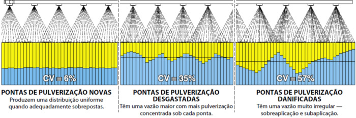 Nesse sentido, existem diferentes tecnologias para a pulverização de alta performance, variando de acordo com cada necessidade. Para uma aplicação eficiente deve ser levado em consideração o tipo de bico a ser utilizado, visando a uniformidade de cobertura. Existem vários tipos de bicos, os mais comuns são os do tipo leque, leque de impacto, cone e indução de ar. Cada modelo gera uma pressão de trabalho, propagação do jato e gotas de tamanhos diferentes. Para a seleção dos bicos o produtor deve estar atento às condições operacionais e climáticas.