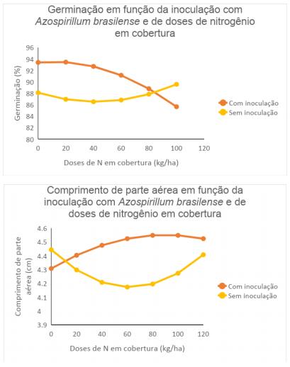 Brzezinski et. al. (2014), ao pesquisar sobre a inoculação com Azospirillum brasilense na qualidade fisiológica e sanitária de sementes de trigo, chegou à conclusão que na inoculação da cultivar BRS 220 houve uma maior porcentagem de germinação até a dose de 90 kg ha-1 de N em cobertura em relação às sementes não inoculadas (Figura 2), possivelmente pela função do nutriente na formação do embrião e órgãos de reserva. Além disso, também houve um incremento do comprimento de parte aérea das plântulas, com as maiores diferenças para a dose de 60 kg ha-1 em relação às sementes não inoculadas (Figura 2).