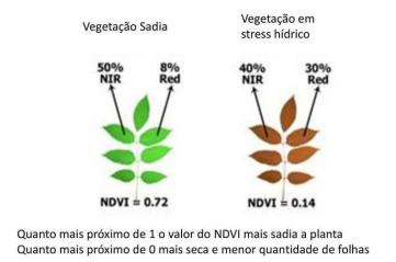 Dessa forma, a tecnologia no campo permite acompanhar de perto o desenvolvimento da lavoura e auxilia o gestor a colocar em prática as ações necessárias para o melhor andamento da produção. Entre os índices de monitoramento mais comuns, podemos citar o Índice de Vegetação da Diferença Normalizada (NDVI). Com o SR conseguimos captar o vigor das plantas, o que possibilita avaliar a saúde da planta. Com isso, é possível fazer uma relação com a estimativa de produção. Isso é possível pois a banda de radiação do NIR — Infravermelho Próximo, diferencia plantas vigorosas (que refletem mais o NIR) e plantas mais fracas (que absorvem a radiação). As imagens em NIR, obtidas por satélites, são tratadas em uma equação denominada NDVI que transforma as leituras de NIR em tons de cores.
