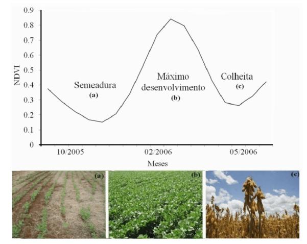 destaque a evolução temporal do NDVI nas etapas de semeadura (A), máximo