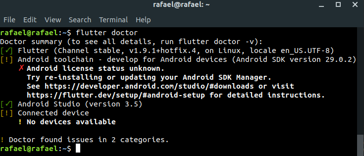 Após a instalação abra o terminal e digite: flutter doctor e aparecerá a seguinte tela, significando que o Flutter está instalado e o Android Studio também.