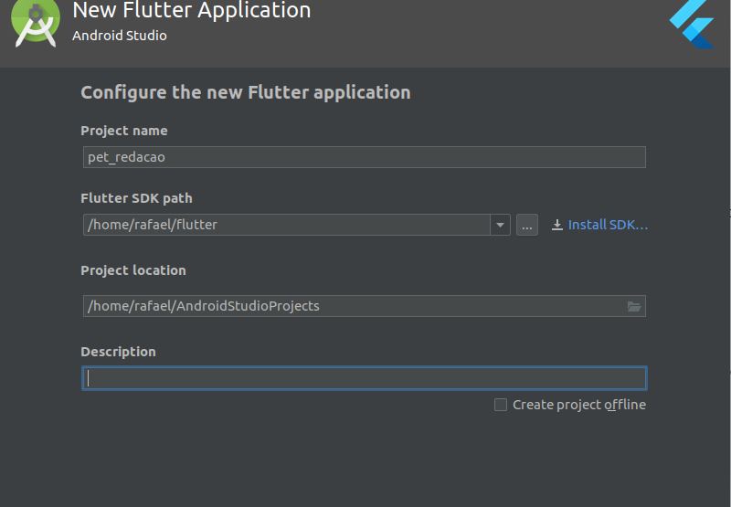 Vamos criar um projeto, para isso clique em Start a new Flutter project e em Flutter Application, escolha um nome para o projeto e selecione o PATH do Flutter, bem como a localização desejada do projeto: