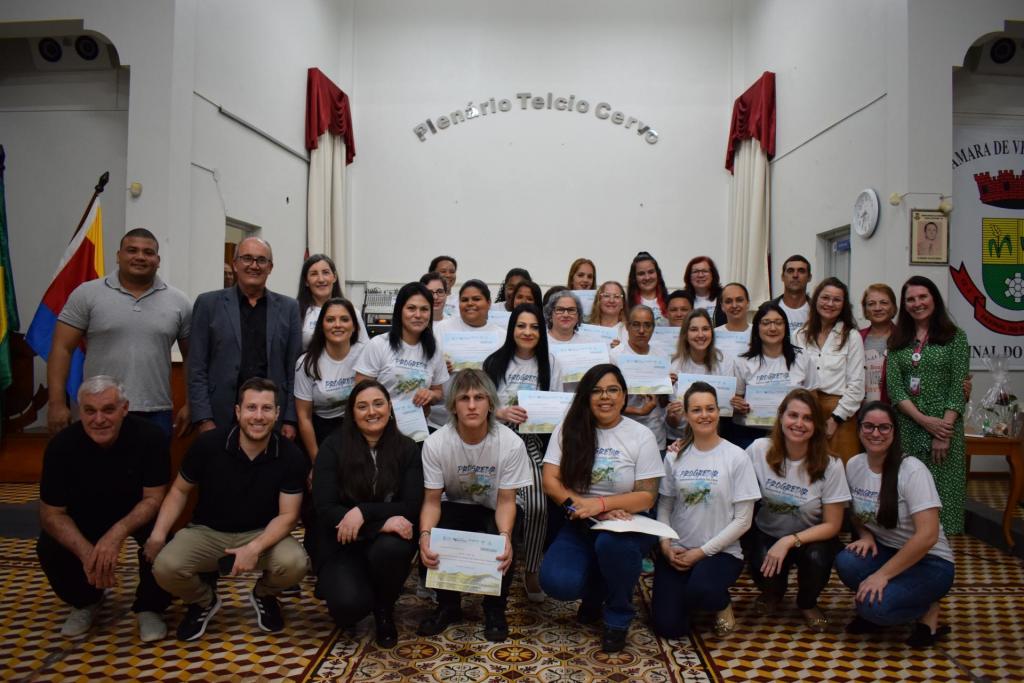 Foi realizada, na noite de ontem, 02 de agosto, a formatura de dois cursos promovidos pelo Progredir Geoparque Quarta Colônia em Faxinal do Soturno. No total, 33 estudantes foram certificadas/os nos cursos de Introdução ao Secretariado e de Informática Básica. A cerimônia contou com a participação da equipe do projeto, representantes da UFSM, do Centro de Referência da Assistência Social (CRAS) e da Prefeitura de Faxinal do Soturno, além de familiares e de amigos das/os formandas/os.