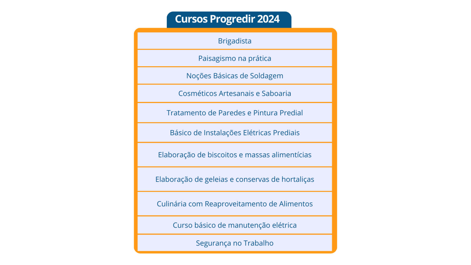 No primeiro semestre de 2024, o programa já ofertou sete novos cursos gratuitos de qualificação profissional: Cosméticos Artesanais e Saboaria; Culinária com Reaproveitamento de Alimentos; Brigadista; Capacitação de Trabalhadores para Tratamento de Paredes e Pintura Predial; Curso Básico de Instalações Elétricas Prediais; Elaboração de Biscoitos e Massas Alimentícias; e Soldagem com Eletrodos Revestido e Noções Básicas de Soldagem pelo Processo MIG/MAG – capacitando um total de 117 alunos.