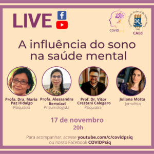 Durante ou após o enfrentamento de eventos estressantes, como a pandemia por COVID-19, é comum o enfrentamento de dificuldades relacionadas ao sono, como seu excesso ou diminuição. Esse processo pode ter consequências relacionadas à saúde mental e ao bem-estar geral. Por isso, o tema da live dessa semana será “A influência do sono na saúde mental” pela Psiquiatra Maria Paz Hidalgo, pela Pneumologista Alessandra Bertolazi pelo Psiquiatra Vitor Crestani Calegaro e pela Jornalista Juliana Motta dia 17 de novembro, às 20h