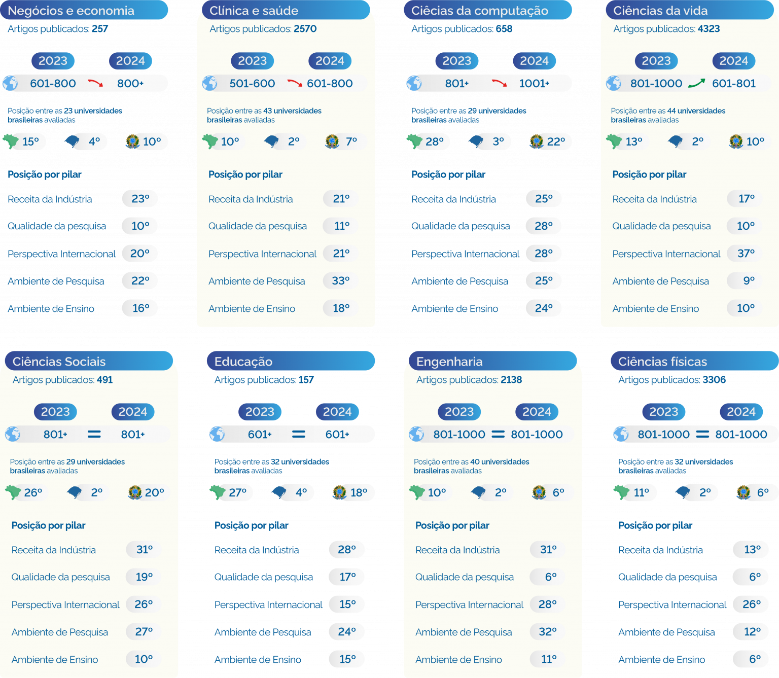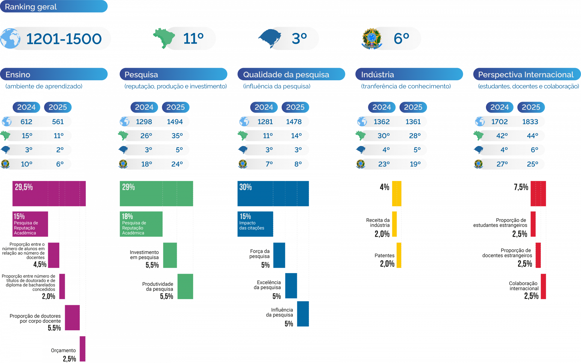 O Ranking THE World University Ranking by Subject, utiliza os mesmo 5 pilares em 18 indicadores de desempenho usados no World Ranking 2024.