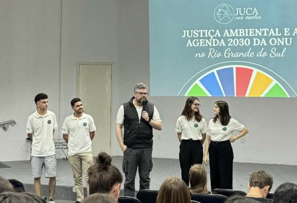 No dia 17 de outubro de 2025, o Programa Juca nas Escolas realizou uma palestra na Escola Municipal de Ensino Fundamental 7 de Setembro, no município de Agudo (RS), destinada aos alunos do 4º, 5º, 6º e 7º ano do ensino fundamental. A atividade abordou os Objetivos de Desenvolvimento Sustentável (ODS), com ênfase no ODS 13 – Ação Contra a Mudança Global do Clima e no ODS 15 – Vida Terrestre. Por meio de uma linguagem acessível e exemplos do cotidiano, os estudantes foram convidados a refletir sobre a importância da preservação ambiental, das ações climáticas locais e da proteção dos ecossistemas como parte do compromisso global pela sustentabilidade. O encontro incentivou o debate sobre práticas sustentáveis e o papel de cada cidadão na mitigação dos impactos ambientais, aproximando os alunos das temáticas da Agenda 2030 da ONU e fortalecendo o senso de cidadania e responsabilidade socioambiental.