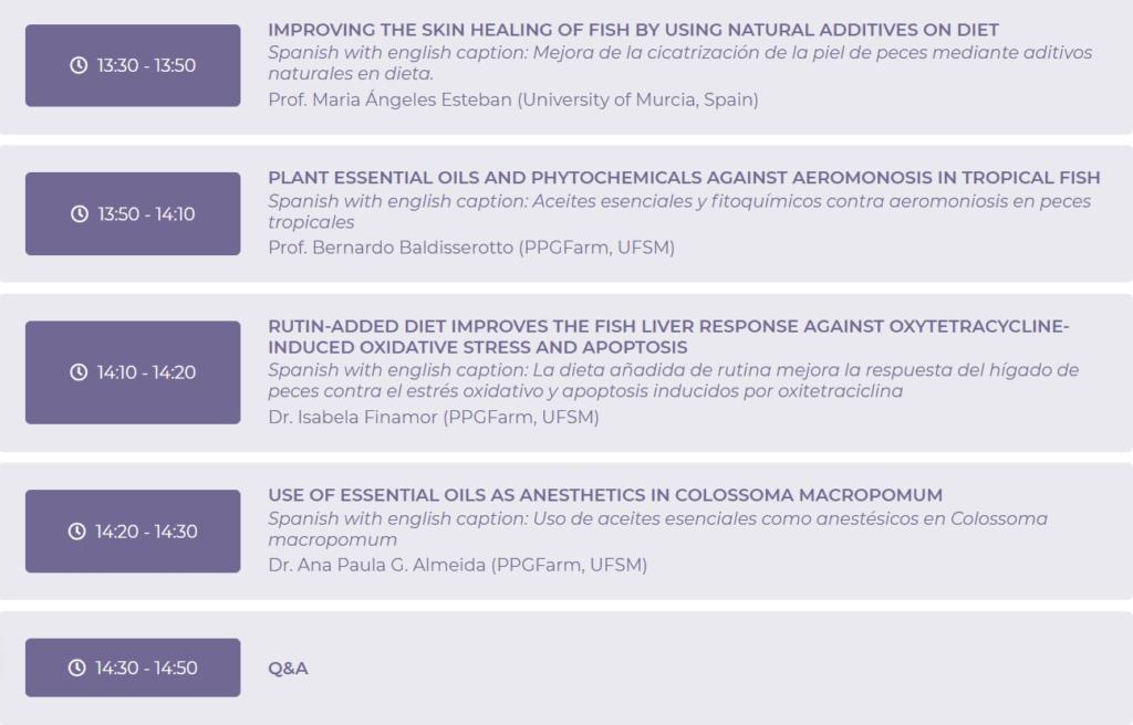 Session 1 – From fish welfare assurance to safe food products – Chair: Prof. Ana Paula G. Almeida (PPGFarm, UFSM) chair: Prof. Maria Amália Pavanato (PPGFarm, UFSM)