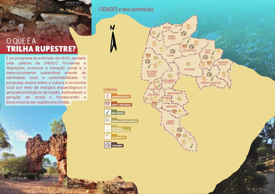 A Trilha Rupestre é um programa institucional da Universidade Federal do Mato Grosso do Sul (UFMS) que visa ao fortalecimento cultural, turístico e econômico entre os municípios sul-matogrossenses do corredor ecológico Cerrado-Pantanal. Algumas ações têm sido desenvolvidas para fomentar a economia local de maneira sustentável, com a capacitação da comunidade para a circulação de renda através da Bioeconomia. A Rota Rupestre pode apresentar, para além da arqueologia, o turismo sustentável, rural, ecologicamente correto e que preserva suas riquezas. O projeto pensa na “necessidade do passado” para uma melhor compreensão do presente e a projeção do futuro. Os idealizadores do Programa Rota Rupestre são a arqueóloga Lia Brambilla e o professor Ivo Leite, ambos da UFMS. Por meio de um acordo de cooperação entre a UFMS e a Universidade Federal de Santa Maria (UFSM), o Laboratório de Arqueologia, Sociedades e Culturas das Américas (LASCA), do qual o professor André Luis Ramos Soares é o coordenador, vai colaborar com os levantamentos arqueológicos a serem realizados, a exemplo da escavação arqueológica na cidade de Alcinópolis, que fica no sítio Barro Branco. Também vamos desenvolver trabalhos relacionados à Educação Patrimonial na região. Considerando os aspectos de desenvolvimento social, cultural e dos eixos que compõe a Trilha, a Cátedra UNESCO se orgulha de apoiar este programa desde sua criação.