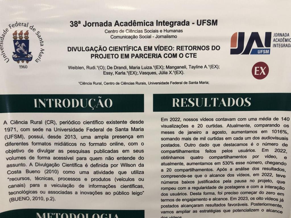 Durante a 38ª JAI a equipe de comunicação apresentou o trabalho “DIVULGAÇÃO CIENTÍFICA EM VÍDEO: RETORNOS DO PROJETO EM PARCERIA COM O CTE”. O objetivo foi analisar o alcance dos vídeos publicados no ano de 2023, em comparação com os vídeos publicados em 2022, quando retornamos com o projeto “Divulgação Científica em Vídeo”, criado em 2018 e interrompido pela pandemia. A Divulgação Científica é definida por Wilson da Costa Bueno (2010) como uma atividade que utiliza “recursos, técnicas, processos e produtos (veículos ou canais) para a veiculação de informações científicas, tecnológicas ou associadas a inovações ao público leigo”.