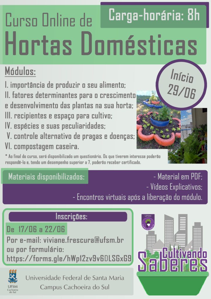 O Projeto “Cultivando Saberes: hortas urbanas e soberania alimentar promovendo saúde e bem-estar em tempos de pandemia”, coordenado pela Profa. Viviane Frescura, está promovendo o Curso Online de Hortas Domésticas.