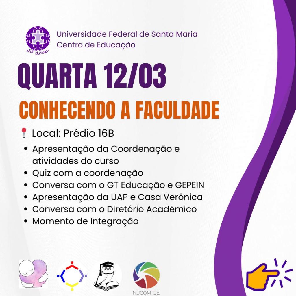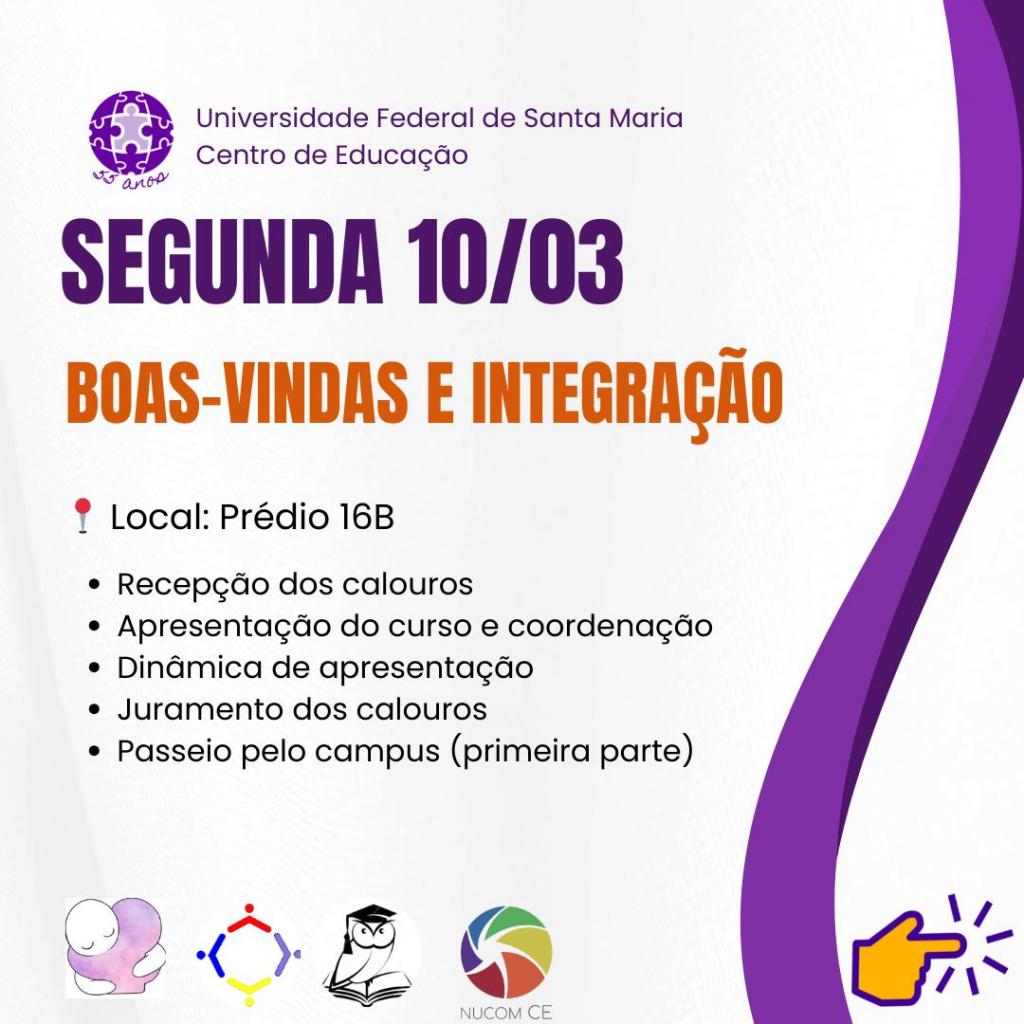 A Unidade de Apoio Pedagógico, as turmas de veteranos dos Cursos de Educação Especial e Pedagogia e o Diretório Acadêmico do Centro de Estudos (DACE) prepararam uma programação especial para receber os calouros e promover a integração entre veteranos e novos alunos.