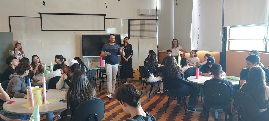 Na quinta-feira (14/11), os estudantes do ensino médio da Escola Estadual Naura Teixeira Pinheiro participaram de uma dinâmica de grupo semelhante às que são adotadas em seleções de emprego no mercado de trabalho. A dinâmica foi coordenada pelo administrador Maurício Medina e pela professora Carmen Rosa, ambos membros da Coordenadoria de Educação Empreendedora da Proinova que foram convidados pelo prof. Tiago Marchesan a participar da recepção aos estudantes. Desde outubro os estudantes realizam visitas ao Centro de Tecnologia, no âmbito do projeto “Escolas no CT”. O ciclo de visitas deste ano encerrou-se com a atividade empreendedora, mas o projeto terá continuidade em 2025.