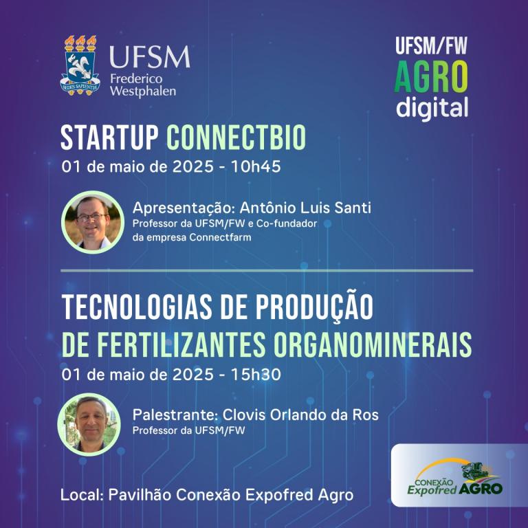 Na manhã do dia 1 de maio, com a temática Grãos, a UFSM/FW inicia a sua participação no Pavilhão Conexão Expofred Agro com o professor Antônio Luis Santi, cofundador da empresa ConnectFARM e docente da UFSM/FW, que apresenta a “Startup ConnectBIO”. Em seguida, o professor Santi participa de uma roda de conversa, com o tema “Maquinários, drones e grãos”.