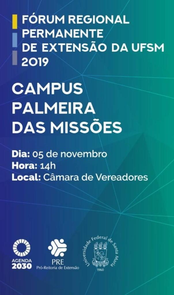 A Pró-Reitoria de Extensão (PRE) realiza na próxima terça, 05, a segunda edição de 2019 do Fórum Regional Permanente de Extensão em Palmeira das Missões. O evento, que é aberto a toda a comunidade regional, será realizado às 14h na Câmara Municipal de Vereadores de Palmeira das Missões e tem o intuito de ouvir as demandas da comunidade regional, além de fortalecer o vínculo da UFSM nas cidades que abrigam os campi da instituição.