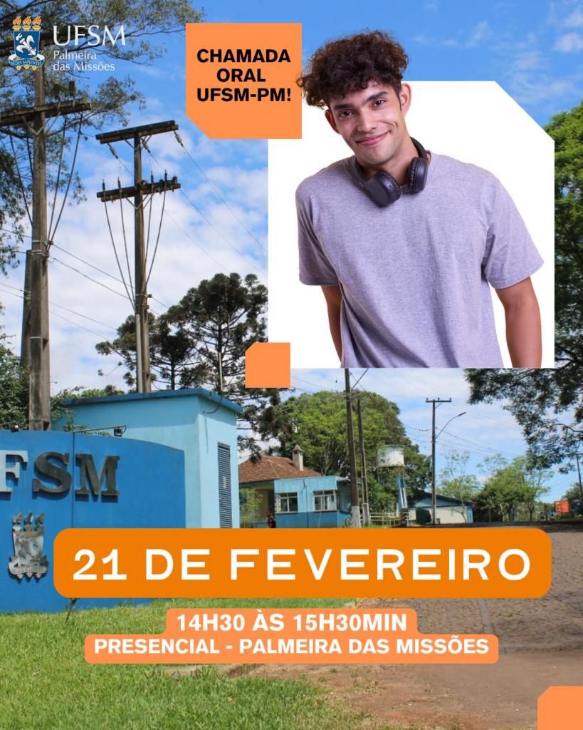 No Campus Cachoeira do Sul, a chamada oral será na quinta (20), à tarde; em Frederico Westphalen, na sexta (21), pela manhã; e em Palmeira das Missões, também na sexta (21), à tarde, (entrada dos candidatos na UFSM-PM: das 14h30min às 15h30min).