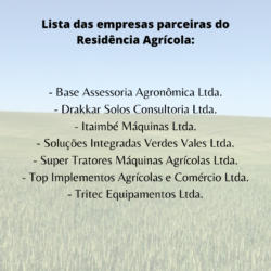 Na empresa, Ricardo trabalha com o gerenciamento dos novos maquinários da John Deere que possuem tecnologia de sistema de telemetria com chip de celular que transmite informações de mapa de colheita, pulverização, velocidade, quantia de aplicação, entre outros dados em tempo real. “Também trabalho com ativação e controle de antenas e monitores”. Confira no quadro ao lado a lista das empresas parceiras do Residência Agrícola.