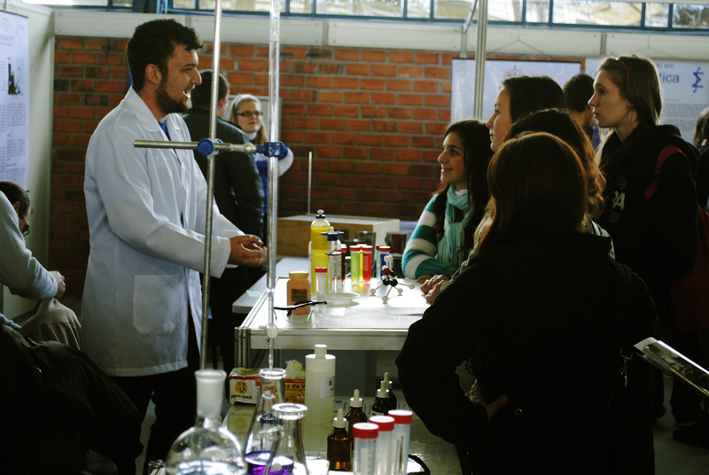 O estande do Centro de Ciências Naturais e Exatas (CCNE) expõe, entre outros cursos, os cursos de Química Licenciatura, Química Bacharela, Química Industrial e Tecnologia em Processos Químicos.