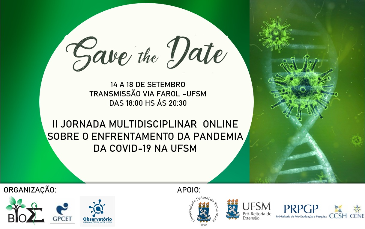A 2ª Jornada Multidisciplinar Online sobre o Enfrentamento da Pandemia da Covid-19 na UFSM será realizada de 14 a 18 de setembro, das 18h às 20h30, com transmissão via Farol UFSM. A programação será divulgada em breve.