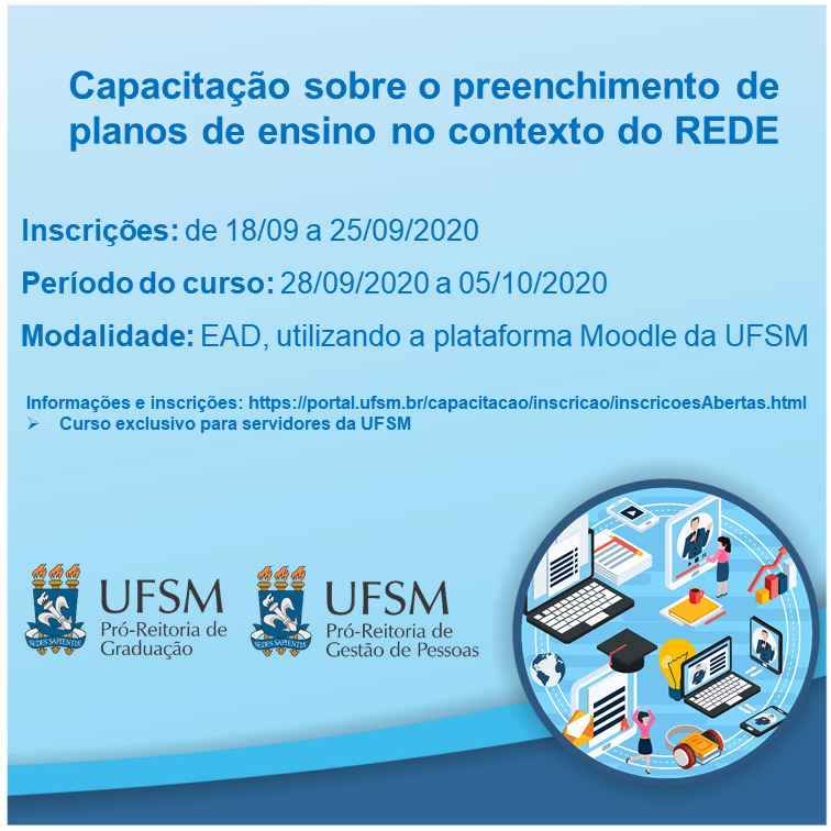Visando incentivar a capacitação dos seus servidores neste momento de suspensão das atividades presenciais, a UFSM, informa que estão abertas as inscrições para a Capacitação sobre o Preenchimento de Planos de Ensino no Contexto do REDE, a qual tem como objetivo capacitar servidores docentes da Instituição para criação de planos de ensino por meio do Portal do Professor atendendo também as especificidades do contexto REDE/UFSM, sendo uma das capacitações relacionadas à formação dos docentes dentro do escopo da UFSM em REDE.