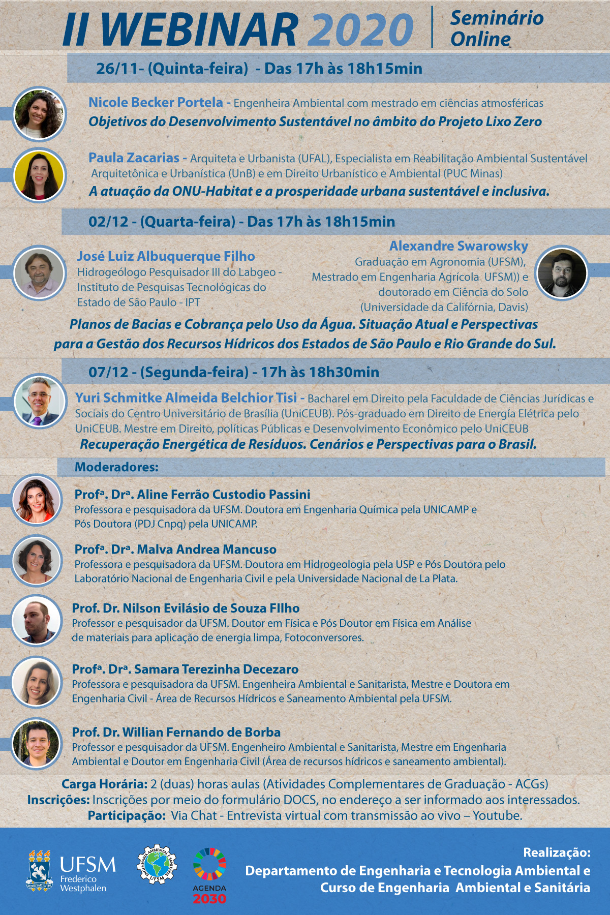 O Departamento de Engenharia e Tecnologia Ambiental e o curso de Engenharia Ambiental e Sanitária da UFSM campus Frederico Westphalen promovem o 2º Webinar de Engenharia Ambiental e Sanitária, que vai discutir assuntos ligados a recursos hídricos e energias alternativas. O evento será na modalidade online, dividido em três encontros, entre os dias 26 de novembro e 7 de dezembro, com transmissão pelo Youtube da UFSM-FW.