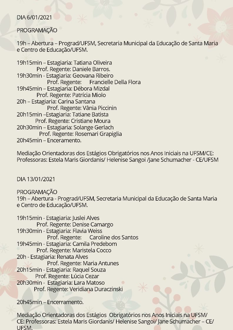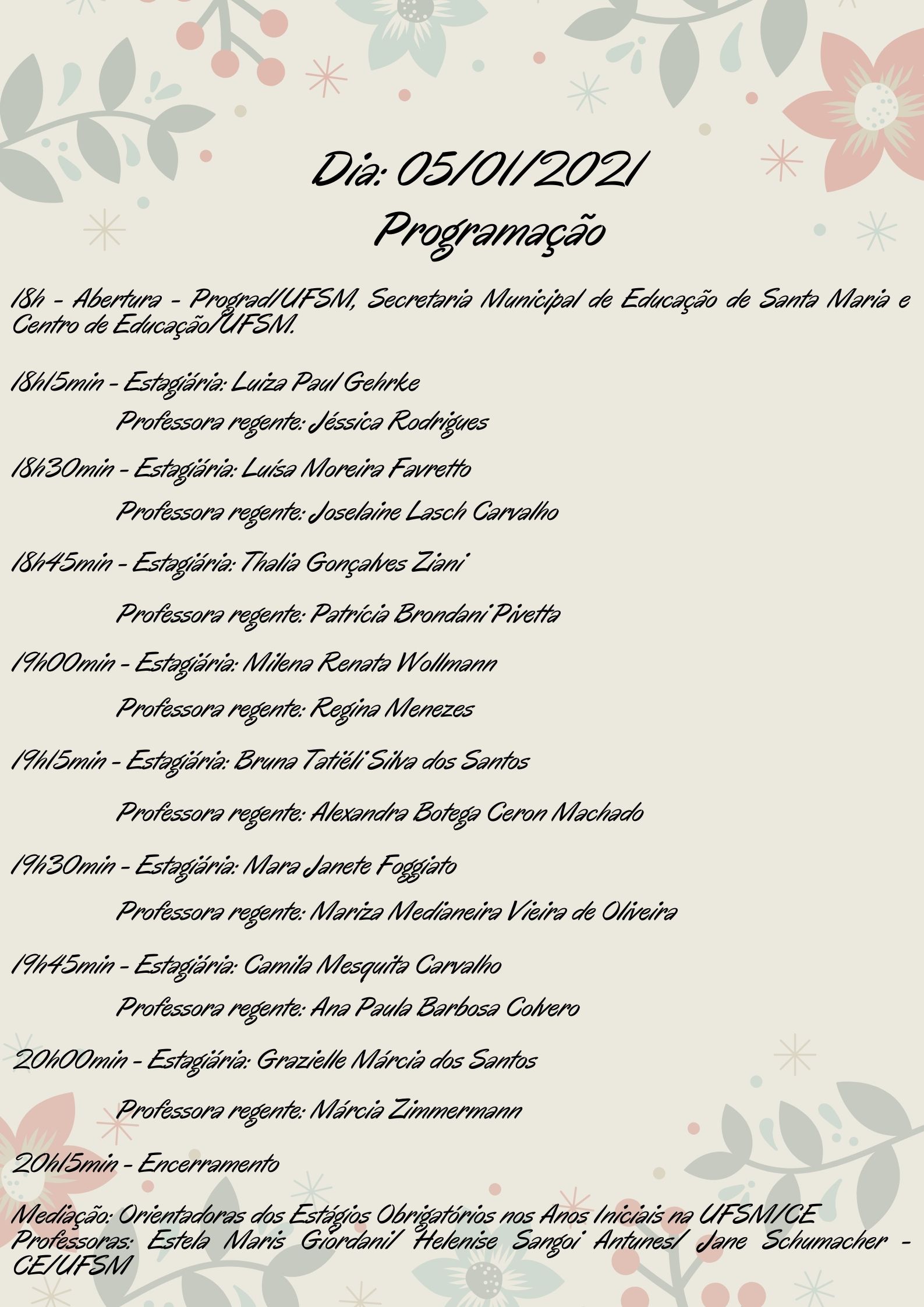 O evento contará com a participação de representantes da Secretaria Municipal de Educação de Santa Maria, apresentação das estagiárias e das respectivas professoras regentes e mediação das professoras orientadoras do Estágios Curricular Obrigatório Remoto nos Anos Iniciais: Estela maris Giordani, Helenise Sangoi Antunes e Jane Schumacher.