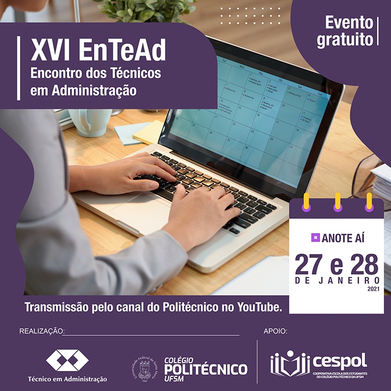 Nos dias 27 e 28 de janeiro, o curso técnico em Administração do Colégio Politécnico da UFSM promoverá o 16º Encontro dos Técnicos em Administração (EnTeAd). O objetivo é promover discussões pertinentes em relação às diversas áreas do curso, construindo conhecimento através da integração entre estudantes, pesquisadores, docentes e profissionais.