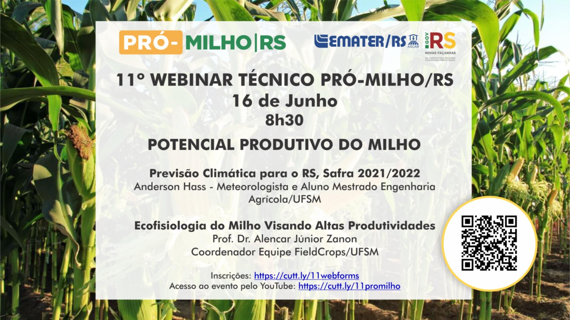 A UFSM foi convidada pela Secretaria Estadual da Agricultura, Pecuária e Desenvolvimento Rural e pela Emater/RS para apresentar suas pesquisas e seu conhecimento no 11º Webinar Técnico Pró-Milho, que ocorre nesta quarta-feira (16), a partir das 8h30, com transmissão ao vivo e simultânea pelo Facebook e pelo YouTube do programa Rio Grande Rural, da Emater. O tema do evento é “Potencial produtivo do milho”.
