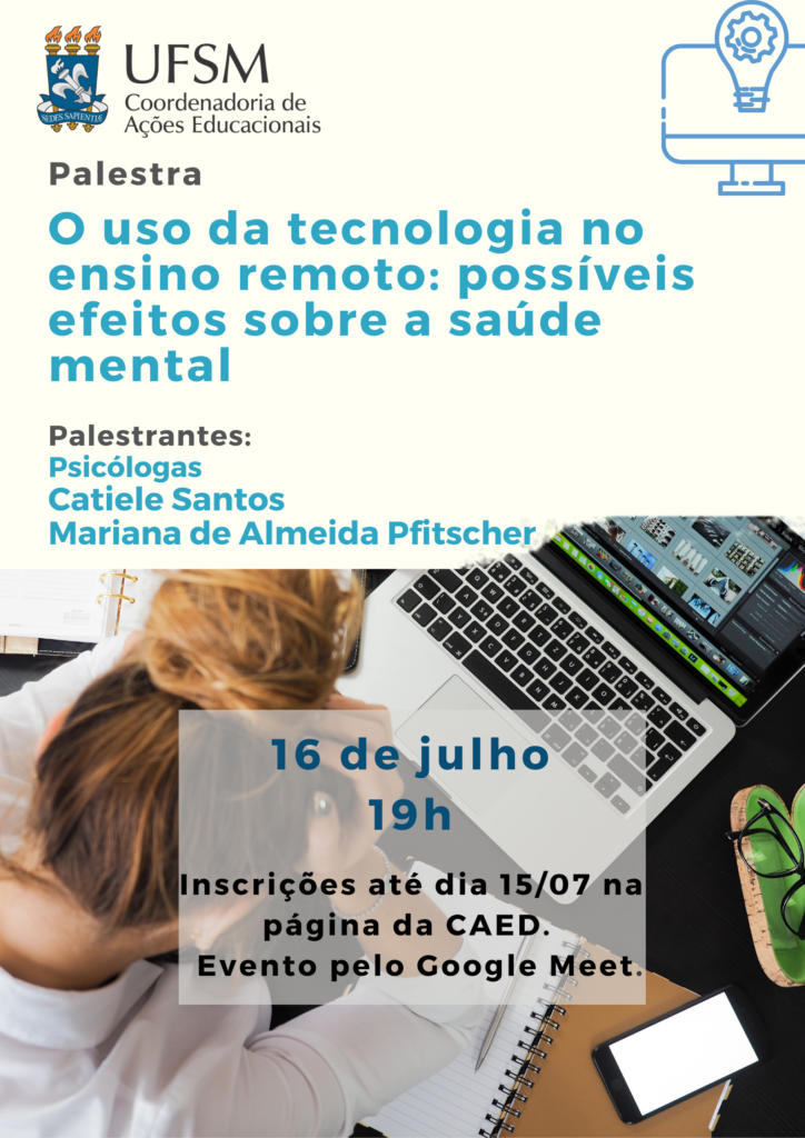 Descrição da imagem: Imagem retangular na vertical. Da metade para cima o fundo é na cor branca. No canto superior esquerdo tem a logo da CAED, composto pelo brasão da UFSM à esquerda e Coordenadoria de Ações Educacionais à direita. Abaixo, escrito em letras na cor preta, consta: “Palestra”. Em seguida, em letras maiores e na cor azul, o título: “O uso da tecnologia no ensino remoto: possíveis efeitos sobre a saúde mental”. Em letras menores, “Palestrantes (na cor preta) Psicólogas Catiele Santos e Mariana de Almeida Pfitscher (na cor azul). No canto superior direito há o contorno de uma tela de computador com uma lâmpada sobreposta e uma engrenagem dentro da lâmpada. Da metade para baixo, o fundo da imagem é uma fotografia colorida, tirada de cima, de uma mulher loira com as duas mãos na cabeça e os cotovelos sobre uma mesa. Na mesa estão: um notebook, óculos de grau e um caderno aberto. Sobre o caderno estão: uma caneta e um celular. No centro há um retângulo claro e transparente onde consta: “16 de julho 19h (na cor azul) Inscrições até dia 15/07 na página da CAED. Evento pelo Google Meet.” (na cor preta).A UFSM, por meio da Subdivisão de Apoio à Aprendizagem da Coordenadoria de Ações Educacionais (Caed), realiza a palestra “O uso da tecnologia no ensino remoto: possíveis efeitos sobre a saúde mental” no dia 16 de julho, às 19h, via Google Meet. As palestrantes serão as psicólogas Catiele Santos e Mariana de Almeida Pfitscher.