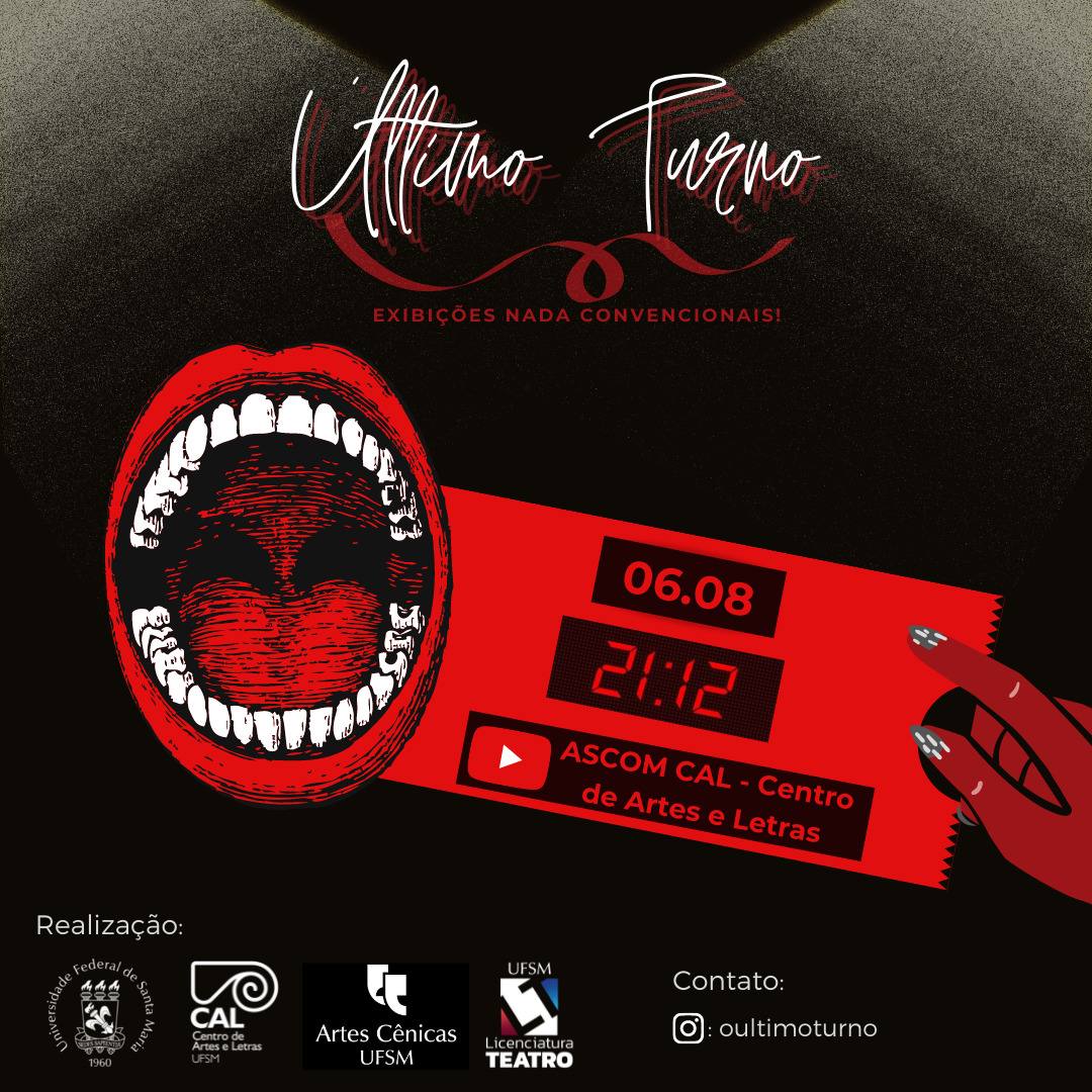 Alunos da disciplina Legislação e Produção Teatral, dos cursos de Artes Cênicas e Licenciatura em Teatro da UFSM, convidam o público para a mostra on-line Último Turno – Exibições Nada Convencionais. Com a intenção de instaurar um espaço livre de amarras e preconceitos, o evento vai reunir os trabalhos produzidos pelos alunos da turma no primeiro semestre de 2021, que serão introduzidos na ocasião por três mestras de cerimônia. O repertório inclui trabalhos artísticos performáticos, musicais e de dança. Nas redes sociais da mostra (Instagram e Facebook), estarão disponíveis informações detalhadas, fotos dos bastidores e teasers de cada atração. A transmissão será nesta sexta-feira (6), a partir das 21h12min, no canal da Assessoria de Comunicação do Centro de Artes e Letras (CAL) no Youtube.