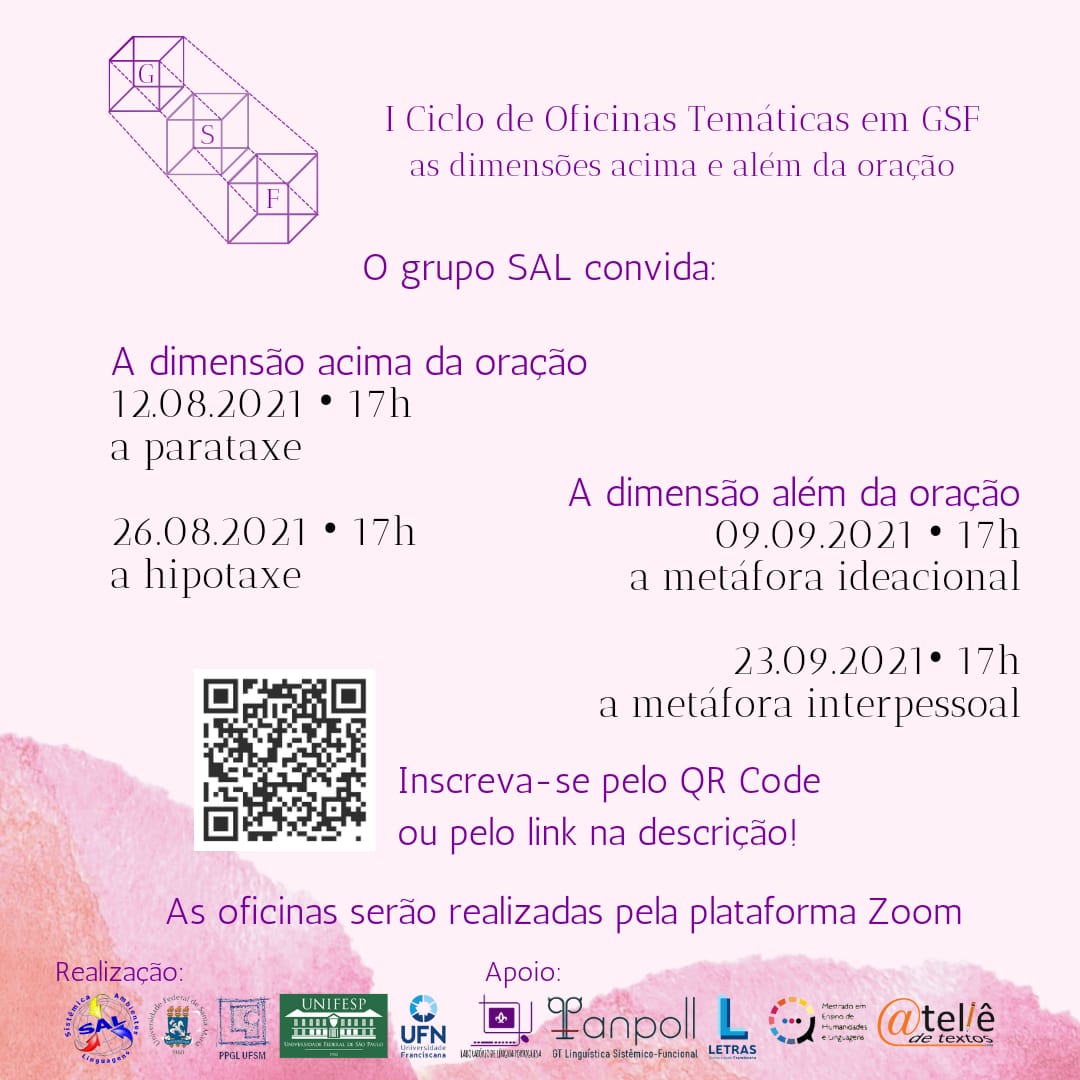 O Grupo Sistêmica, Ambientes e Linguagem (SAL) – do Conselho Nacional de Desenvolvimento Científico e Tecnológico (CNPq) – inicia na próxima quinta-feira (12) o 1º Ciclo de Oficinas Temáticas em Gramática Sistêmico-Funcional (GSF), que terá como tema “As dimensões acima e além da oração”. O objetivo do evento é promover a participação de alunos de graduação e pós-graduação em Letras, além de divulgar as pesquisas da área para a comunidade acadêmica. O simpósio é dividido em quatro oficinas, as quais serão realizadas on-line nas quintas-feiras, às 17h, com um intervalo de duas semanas entre cada uma.