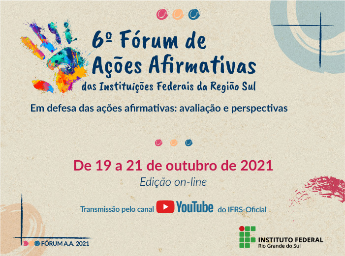 Com o objetivo de refletir sobre avanços nas políticas de ações afirmativas das instituições federais de ensino superior do Rio Grande do Sul, Santa Catarina e Paraná, será realizado o 6º Fórum das Ações Afirmativas das Instituições Federais da Região Sul. Pela primeira vez em edição on-line, o evento ocorrerá de 19 a 21 de outubro, e terá como tema central “Em defesa das ações afirmativas: avaliação e perspectivas”. O Instituto Federal do Rio Grande do Sul (IFRS) é a instituição sede desta edição.