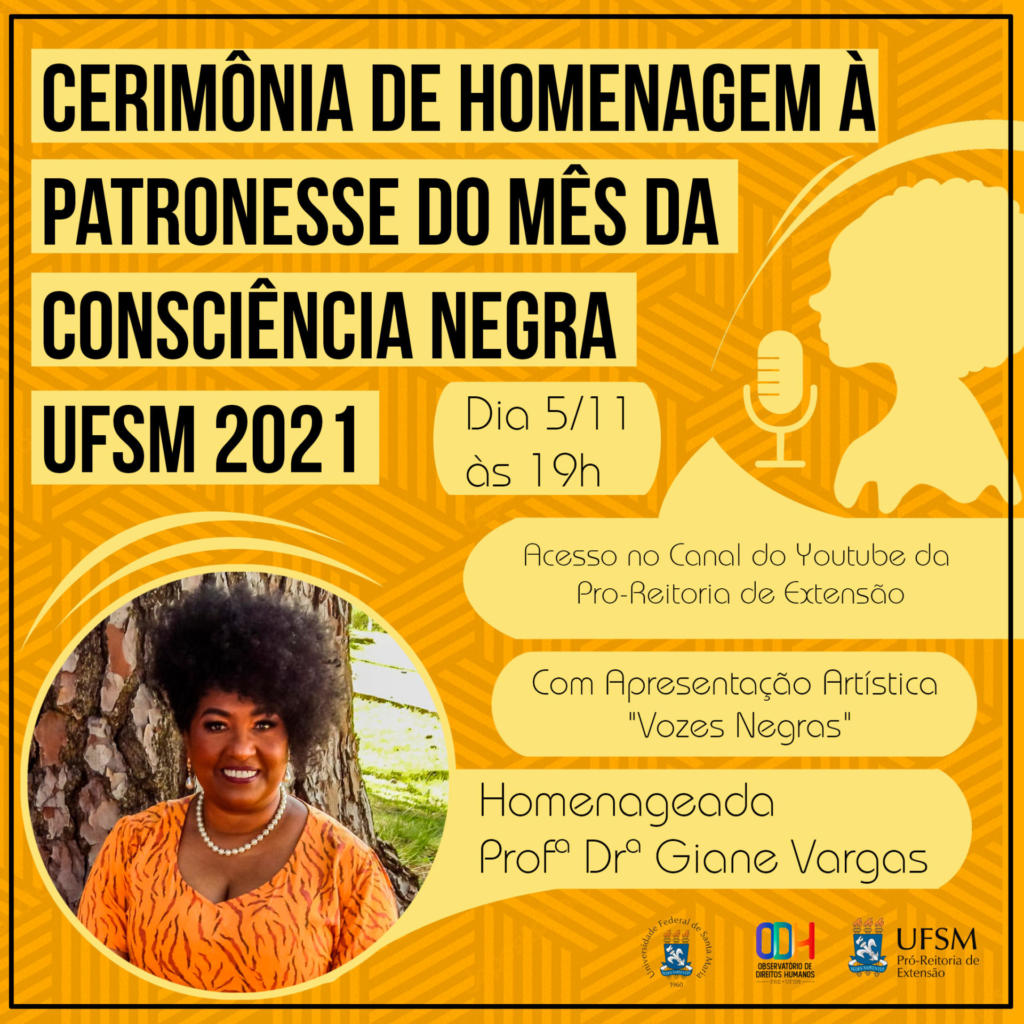 A Abertura do Mês da Consciência Negra esse ano irá ocorrer no dia 5 de novembro, no Centro de Convenções da UFSM, com transmissão ao vivo no canal do Youtube da Pró-Reitoria de Extensão. No evento será realizada uma homenagem a patronesse do mês da consciência negra deste ano, a professora Giane Vargas, docente da Universidade Federal do Pampa, responsável pelo projeto museológico de criação e revitalização do Museu Treze de Maio, o primeiro dedicado à cultura afro-brasileira do Rio Grande do Sul.