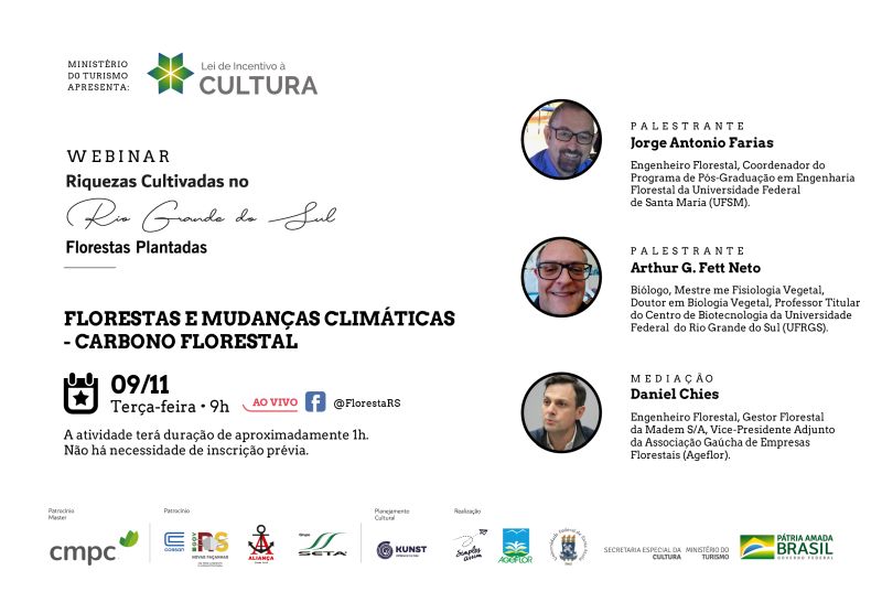 O coordenador do Programa de Pós-Graduação em Engenharia Florestal da UFSM, professor Jorge Antonio Farias, será um dos debatedores do webinar Florestas e Mudanças Climáticas – Carbono Florestal, que ocorre na próxima terça-feira (9), às 9h, com transmissão na página da Associação Gaúcha de Empresas Florestais (Ageflor) no Facebook. A atividade faz parte de uma série de webinars do projeto Riquezas Cultivadas no Rio Grande do Sul – Florestas Plantadas. Também participa da conversa o professor Arthur Germano Fett Neto, pesquisador do Centro de Biotecnologia da Universidade Federal do Rio Grande do Sul. A mediação será de Daniel Chies, gestor florestal da Madem S/A, vice-presidente adjunto da Ageflor e coordenador da Câmara Setorial das Florestas Plantadas da Secretaria Estadual da Agricultura, Pecuária e Desenvolvimento Rural.