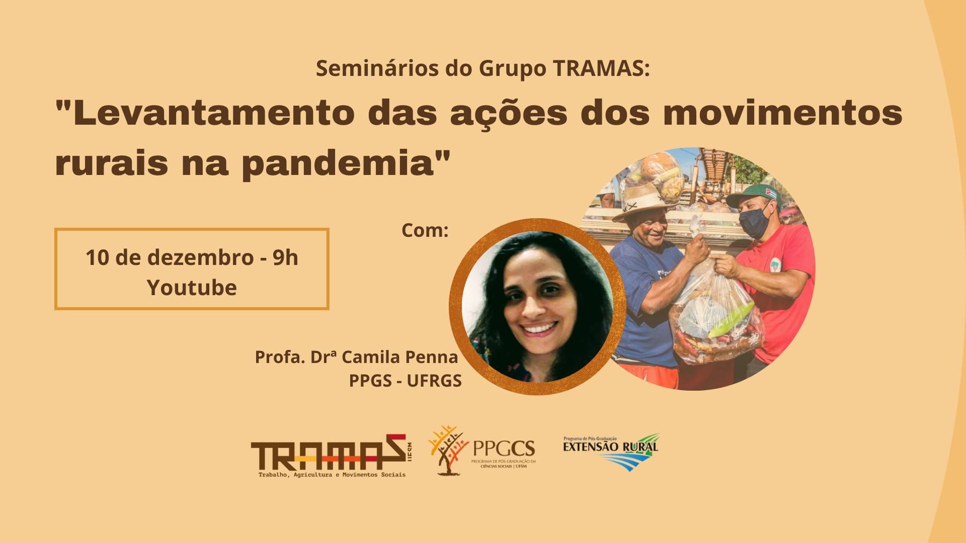 O Grupo de Pesquisa Trabalho, Agricultura e Movimentos Sociais (Tramas), vinculado ao Departamento de Ciências Sociais do CCSH e aos Programas de Pós-Graduação em Ciências Sociais e em Extensão Rural da UFSM, promove o seminário “Levantamento das ações dos movimentos rurais na pandemia” no dia 10 de dezembro, às 9h, pelo canal do YouTube. A convidada, Camila Penna, doutora em Sociologia (UnB), mestre em Ciência Política (UnB) e bacharel em Relações Internacionais (PUC Minas), atua em pesquisas na área dos movimentos sociais, sociologia rural e políticas públicas.