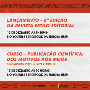 Após o lançamento da revista, ocorrerá uma palestra com Gilson Volpato, referência nacional na redação científica. A apresentação terá como título “Publicação científica: dos motivos aos meios” e tem previsão para começar às 10h. Ao final, serão dados 30 minutos para perguntas. O evento é gratuito e com transmissão ao vivo pela página da Editora UFSM no Facebook e em seu canal no Youtube.