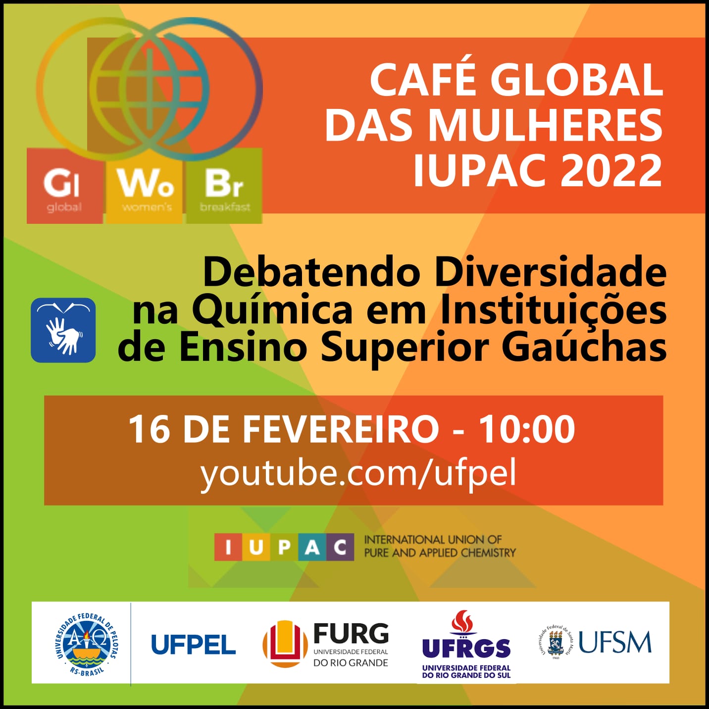 “Debatendo Diversidade na Química em Instituições de Ensino Superior Gaúchas” é o título do evento, que será transmitido no canal da UFPel no Youtube. A programação é constituída por quatro palestras, incluindo ainda períodos para abertura, discussão e encerramento: