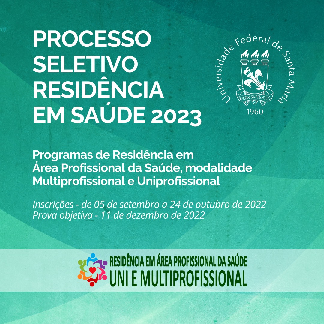 A Universidade Federal de Santa Maria, por meio da Pró-Reitoria de Graduação (PROGRAD) e da Comissão de Residência Multiprofissional (COREMU), divulga a abertura de inscrições do processo seletivo, para ingresso em 2023, dos Programas de Residência em Área Profissional da Saúde, modalidades Uniprofissional (Medicina Veterinária) e Multiprofissional.