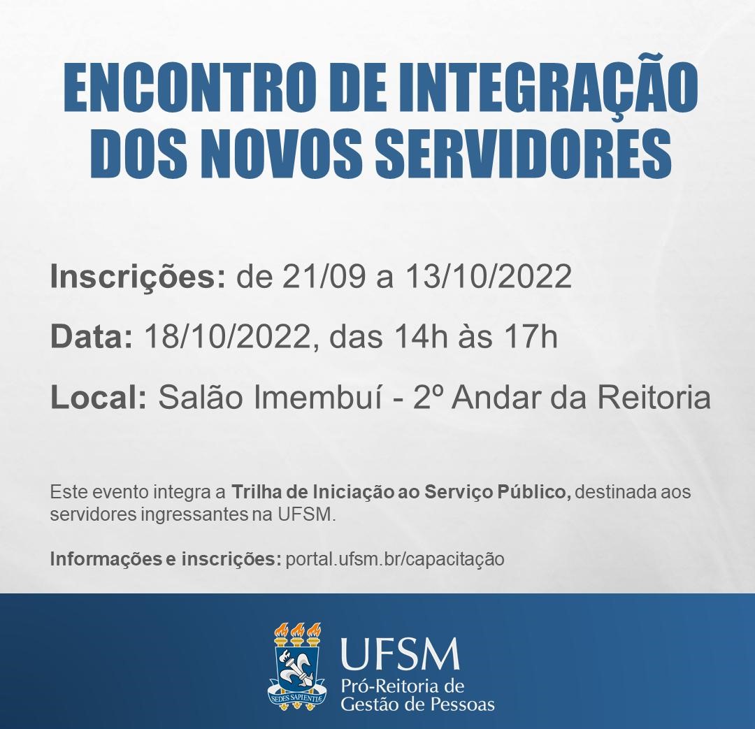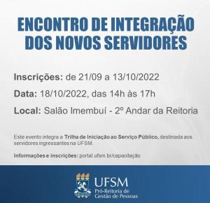 A Pró-Reitoria de Gestão de Pessoas (Progep) informa que estão abertas as inscrições para o Encontro de Integração dos Novos Servidores (turma 2 de 2022). O objetivo do encontro é promover a integração dos servidores ingressantes na UFSM, proporcionando um momento de acolhimento e reflexão acerca do seu papel enquanto servidor público.