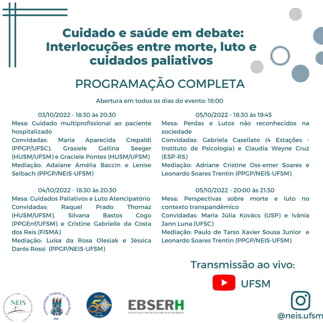Serão discutidas, junto com profissionais de referência em diferentes áreas da saúde, as seguintes abordagens: cuidado multiprofissional a pacientes hospitalizados; cuidados paliativos e luto antecipatório; perdas e lutos não reconhecidos na sociedade; perspectivas sobre luto e morte no contexto transpandêmico. Entre os painelistas, estão professores da UFSM, Universidade Federal de Santa Catarina (UFSC), Universidade de São Paulo (USP) e Escola de Saúde Pública do Estado do Rio Grande do Sul (ESP-RS). A programação completa está disponível na imagem ao lado.