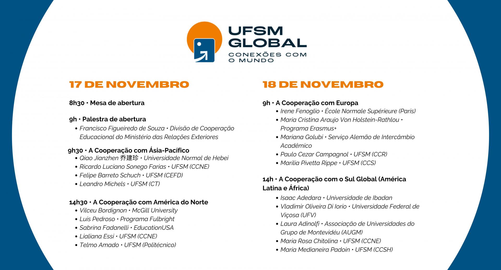 O evento, que pode ser acessado neste link, simboliza a estreia da marca UFSM Global: uma iniciativa desenvolvida pela SAI que busca expandir as barreiras da internacionalização dentro da universidade, que conta com o apoio da CAPES (Coordenação de Aperfeiçoamento de Pessoal de Nível Superior). Ele será composto por quatro mesas de discussão, cada uma focando em uma região do mundo (Ásia-Pacífico, América do Norte, Europa e Sul Global), com a participação de pesquisadores estrangeiros que possuem forte colaboração com a UFSM e representantes de organizações de fomento à cooperação e à mobilidade acadêmica e científica internacional. Para conduzir os debates, participarão pesquisadores de diversos centros da UFSM, que possuem colaborações internacionais de sucesso. Nas mesas, serão discutidos tanto temas gerais relacionados ao processo de internacionalização quanto às particularidades desse processo no âmbito de cada região do globo em cada nível de ensino. Confira a programação completa a seguir: