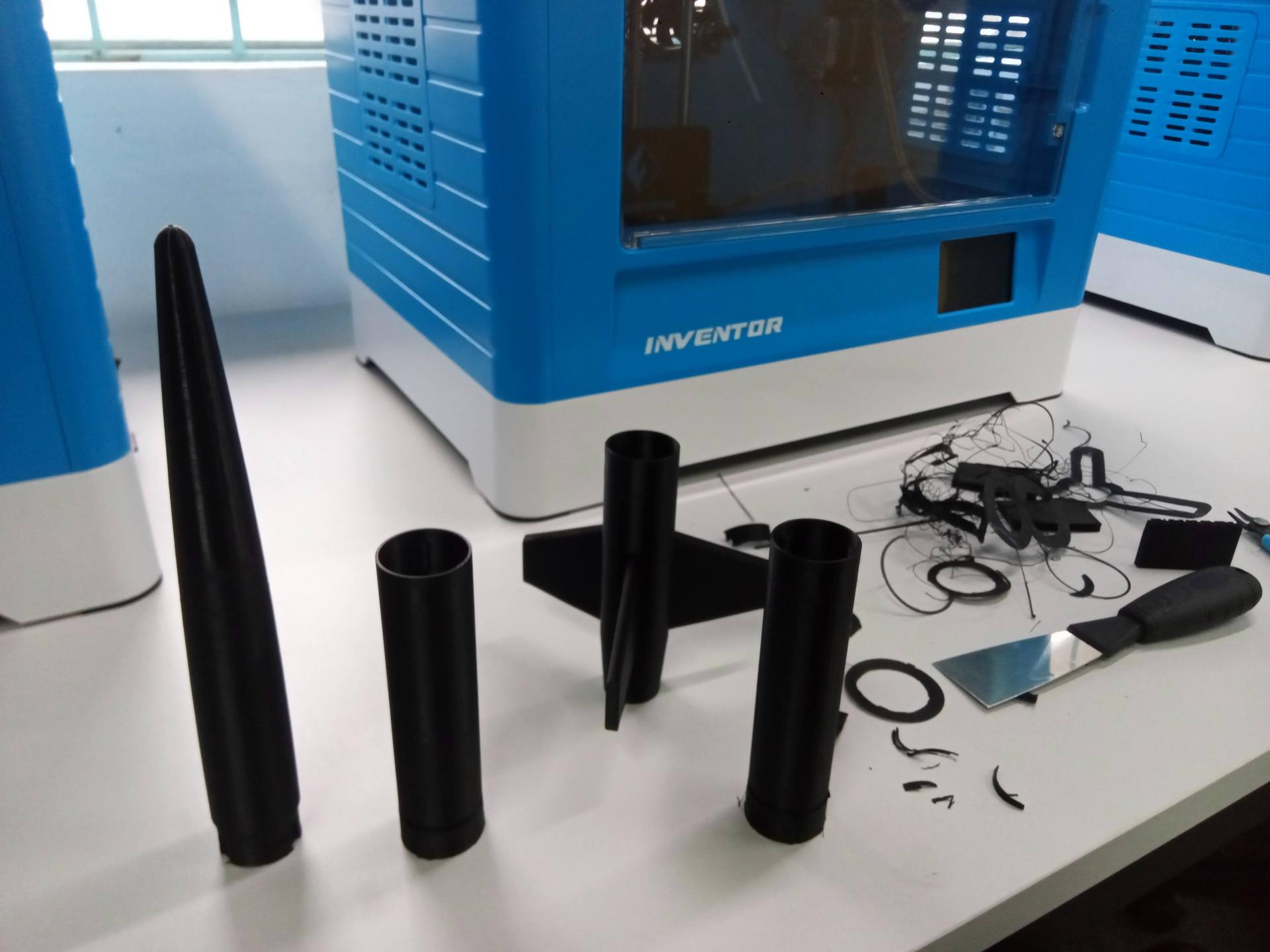 No início deste mês, em uma oficina realizada na Semana Acadêmica da Física, decolou do campus sede um foguete da UFSM 100% fabricado em impressora 3D. Trata-se de um foguete de plástico PLA (sigla pela qual é conhecido o polímero ácido polilático) com 573 milímetros de altura, pesando 116 gramas. Para lançá-lo ao céu, um rojão do tipo treme-terra serviu de “motor” para o foguete.