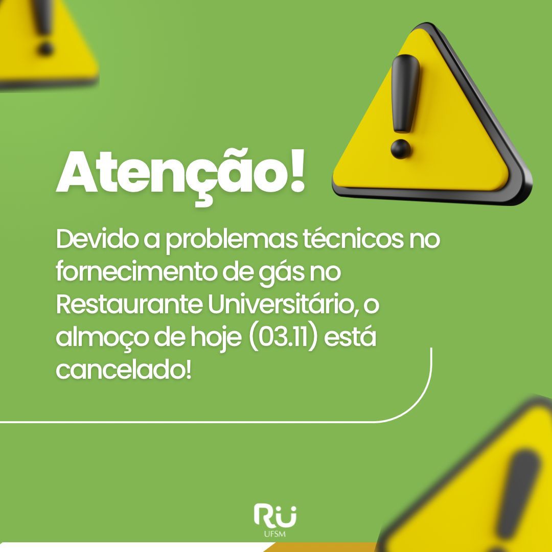A direção do Restaurante Universitário informa que está cancelado o fornecimento de almoço no dia 03 de novembro. O cancelamento é válido para as duas unidades do RU no campus sede.