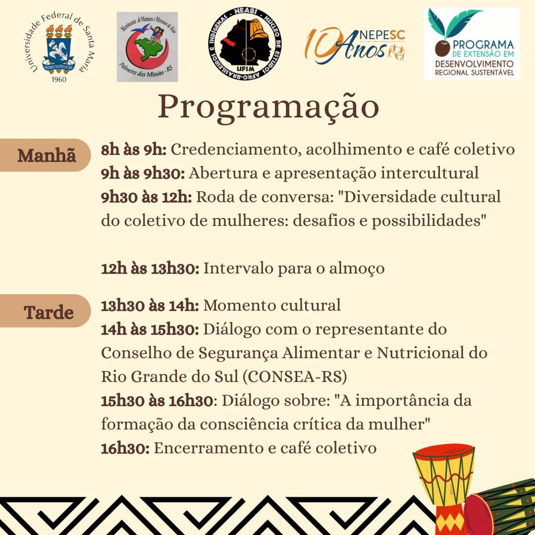 Entre as atividades a serem realizadas, estão a roda de conversa “Diversidade cultural do coletivo de mulheres: desafios e possibilidades”, às 9h30min; um diálogo com representante do Conselho de Segurança Alimentar e Nutricional do Rio Grande do Sul, às 14h; e, às 15h30min, um diálogo sobre “A importância da formação da consciência crítica da mulher”. A programação completa está disponível na imagem acima.